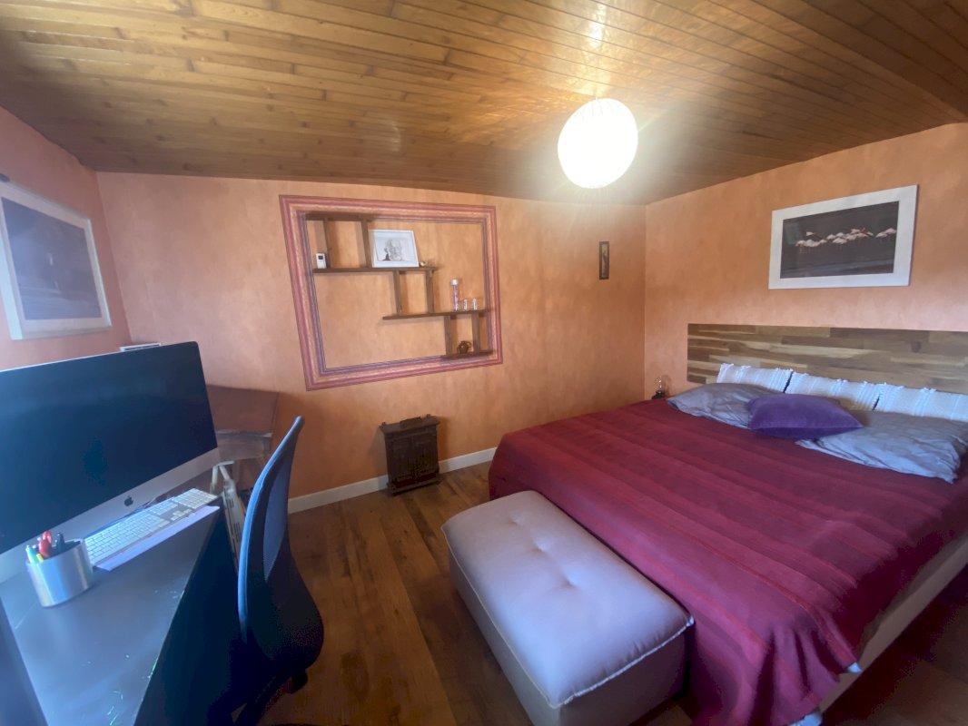 À l'intérieur, un beau séjour - salle à manger lumineux avec une cuisine moderne Arthur Bonnet, 3 chambres plus un bureau (ou chambre d'enfant), une salle de bain, une salle de douches, 2 WC, garage-atelier, cave, abris-voiture avec prise renforcée pour voiture électrique.