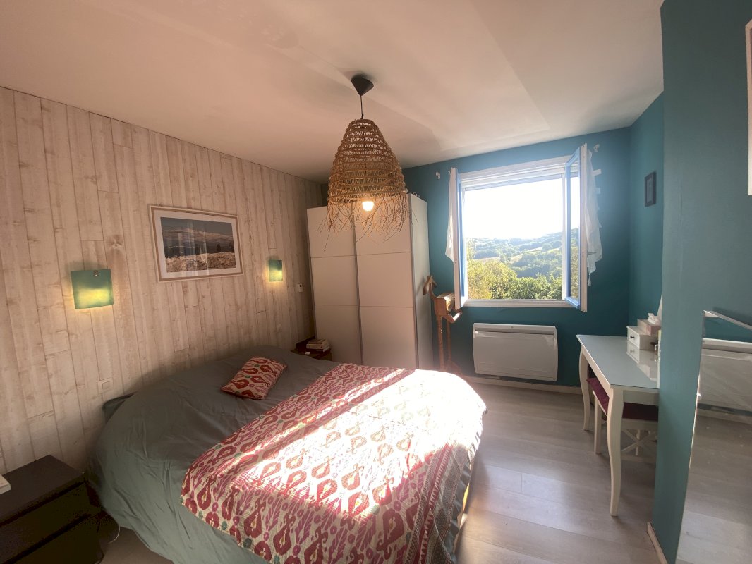 Promontoire sur la nature environnante protégée (Natura 2000 garantit l'absence de constructions alentours), cette maison des années 1980 vous offre une vue fantastique, un confort douillet (cheminée efficace, chauffages électriques basse consommation), une terrasse où il fait bon vivre, un kiosque idéal pour l'apéritif, un terrain (pentu) de peu d'entretien, une piscine hors-sol sur le paysage et un silence absolu (excepté le chant des oiseaux).