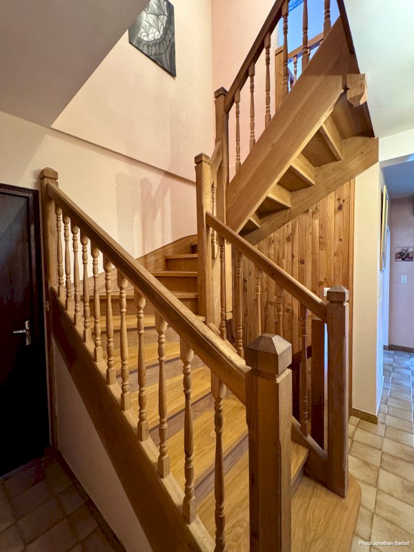 - Parquet vitrifié en chêne massif et châtaignier sur tout l’étage, balustres tournées en chêne.