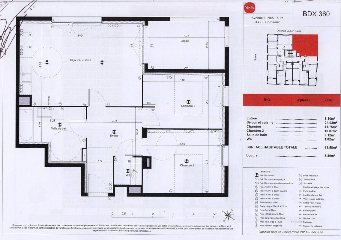 Rue Lucien Faure T3 de 64m² avec Loggia de 8.80m² au 3 ieme étage sur 8, lumineux sans vis à vis avec une petite vue sur le bassin à flot.