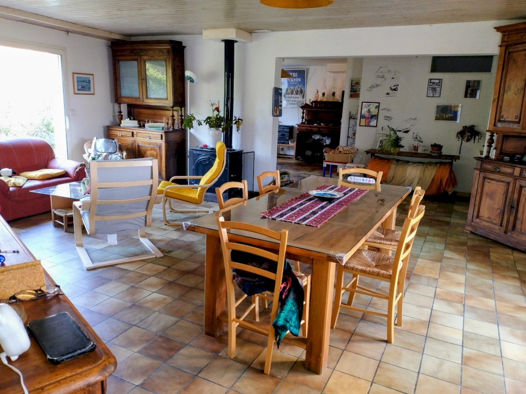 A l'étage, un appartement à visée locative est aménagé, avec une grande chambre, une petite, une cuisine/séjour et une salle de bain. De l'entrée, un escalier mène à un salon/séjour de 44 m² avec poutres apparentes et parquet de bois et 4 autres chambres très grandes ainsi qu'une salle d'eau/WC.