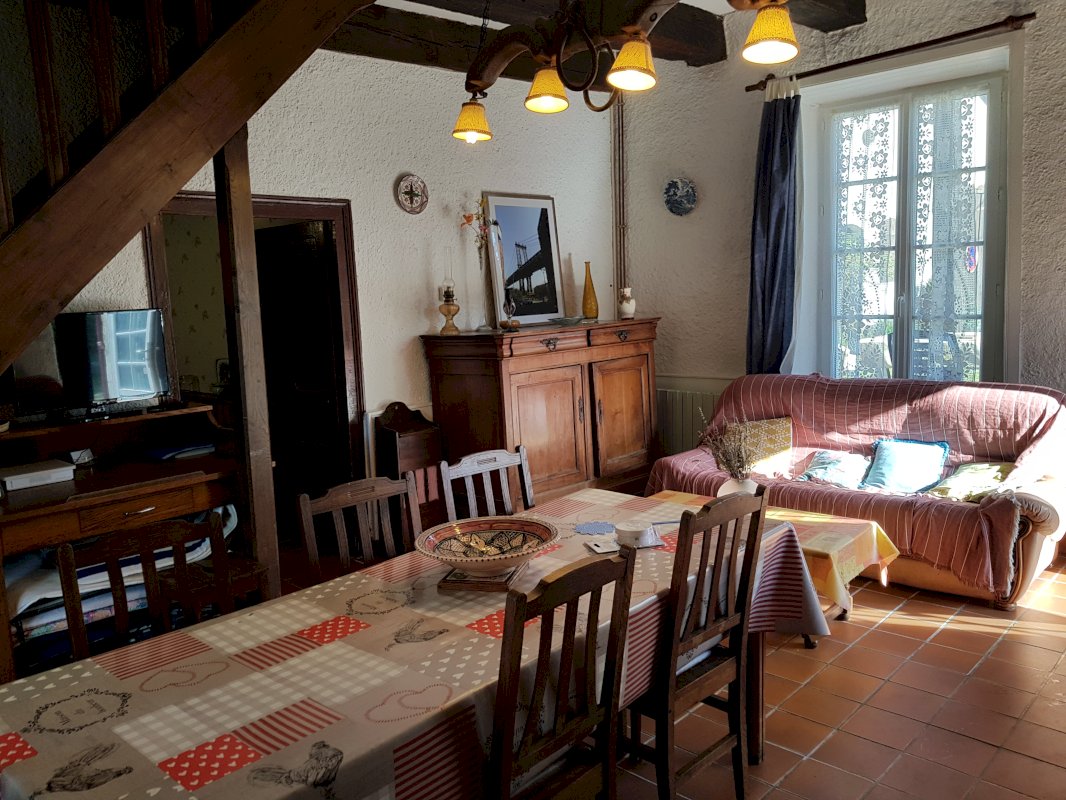 Salon/salle à manger avec cheminée fonctionnelle, cuisine séparée et équipée, salle d'eau, WC indépendant, et grande chambre. chauffage central au fioul.