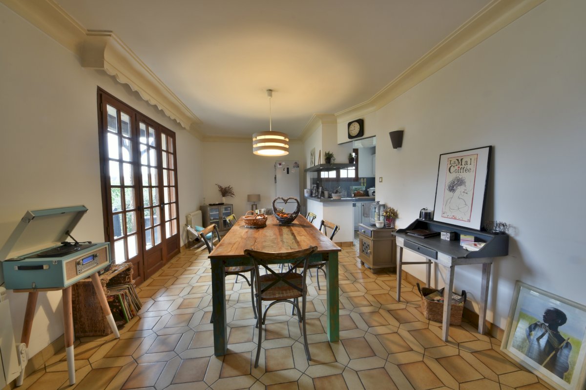 Côté vie : Vous profiterez d’une belle pièce de vie lumineuse, comprenant un salon et un espace dînatoire ouvrant sur une terrasse et son jardin paysagé. Une cheminée vient compléter l’ensemble pour un confort authentique. Une cuisine américaine aménagée.