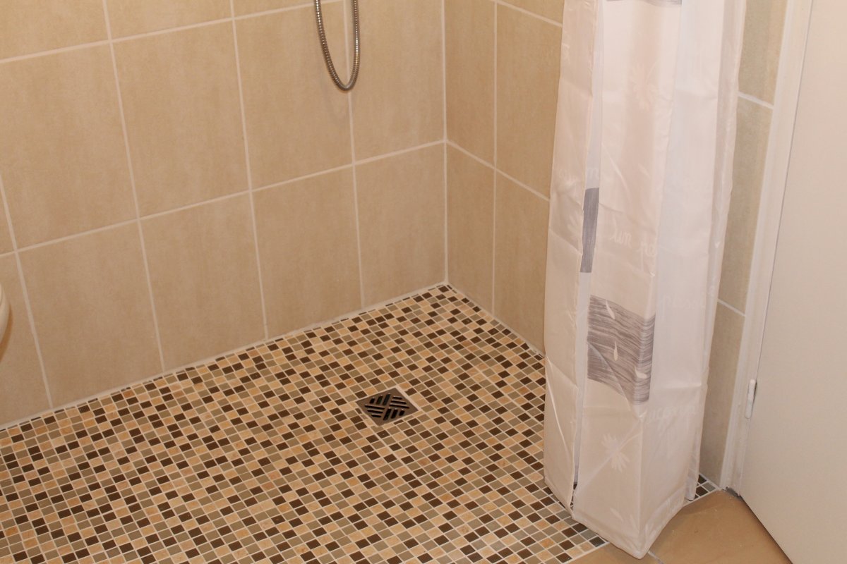 Un appartement de 45 m² neuf avec une cuisine équipée, une chambre avec placard et une salle de bain avec douche italienne et WC.