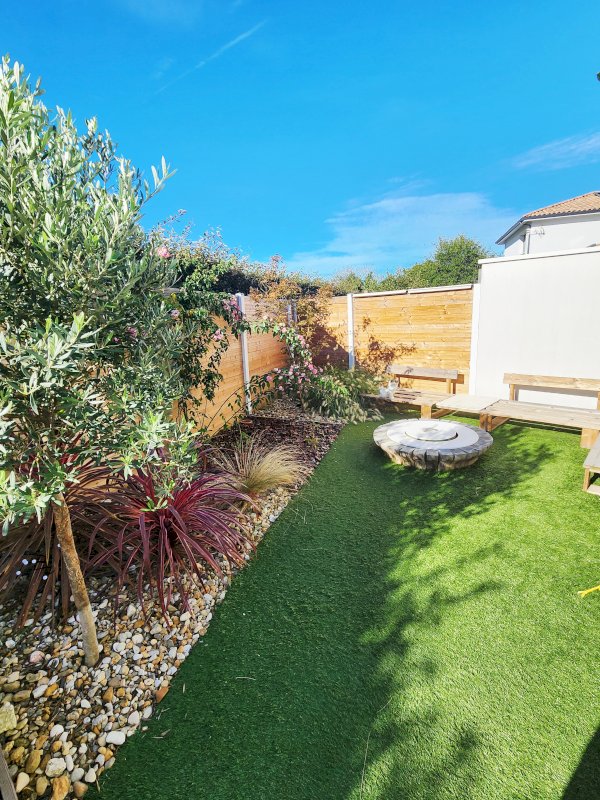 Le jardin et la terrasse sont exposés plein sud et agencés d'une cuisine extérieure ainsi qu'une douche extérieure, sans aucun vis-à-vis.