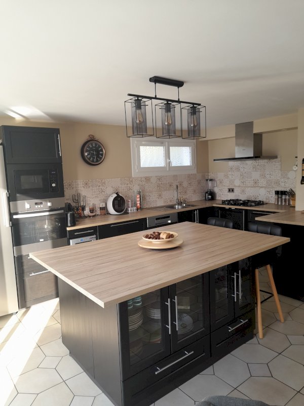 Cuisine ouverte entièrement équipée et aménagée donnant sur un salon avec sa cheminée foyer ouvert, d'une salle à manger superficie totale de 50 m2.