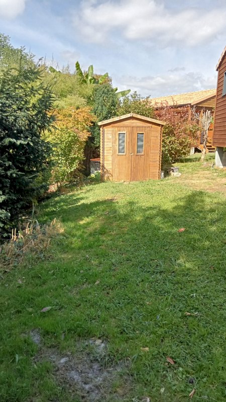 Un petit cabanon bois pour rangement avec prise électrique, et robinet extérieur.
