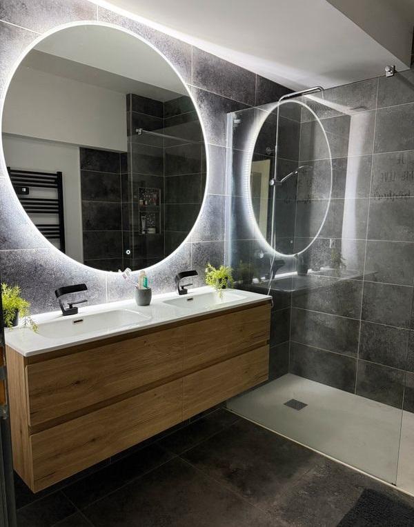 - Salle de bain moderne : Double vasque et douche à l’italienne.