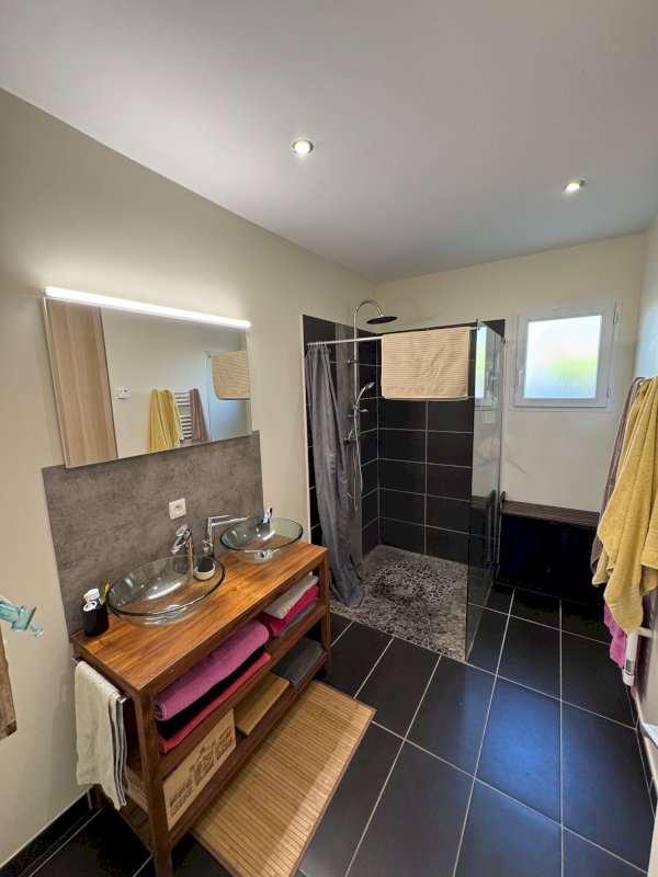 1 salle d’eau avec douche à l’italienne, meuble double vasques et sèche serviette.