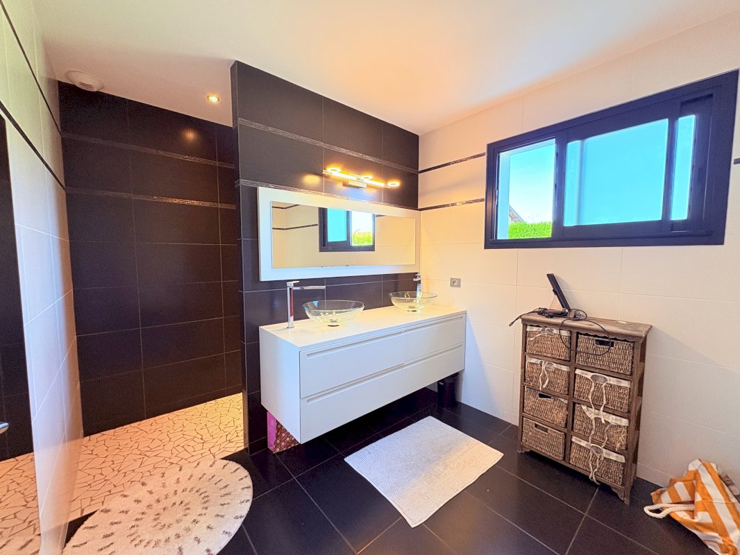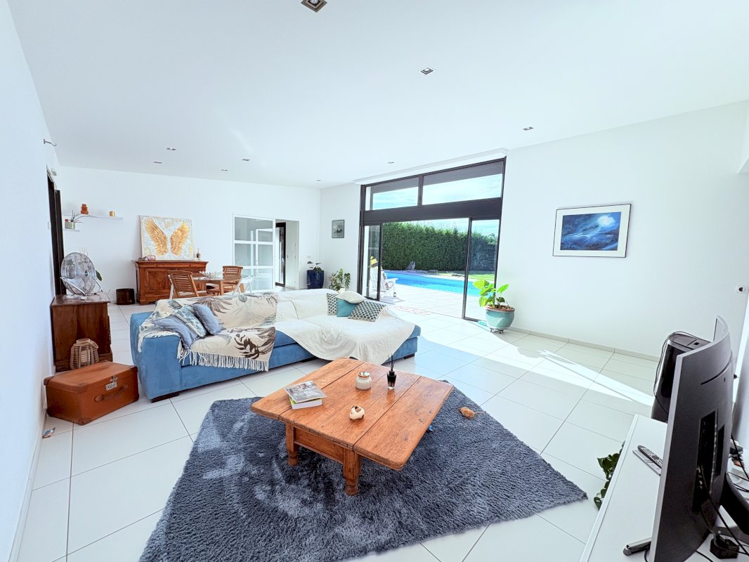 La pièce de vie spacieuse et baignée de lumière s’ouvre grâce à ses baies vitrées à galandage sur une grande terrasse carrelée et une piscine 10x5, offrant un véritable espace de détente et de convivialité.