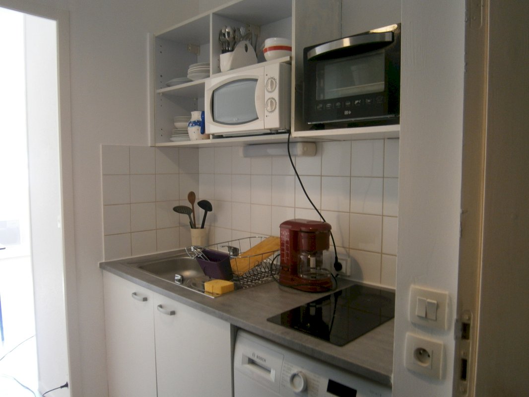 Ce studio est composé d'une entrée avec une kitchenette (avec plaques induction) : menant a une pièce a vivre avec un grand placard de rangement.
