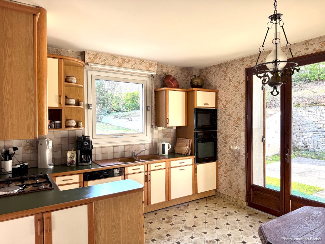 - Cuisine équipée : lave-vaisselle, four électrique et micro-onde intégrés, frigo, plaques de gaz 3 feux (2 bouteilles butanes au sous- sol) + 1 plaque électrique.